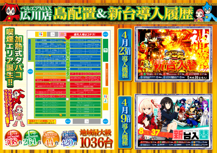 | 特徴 | 選んで遊べる4レート♪ パチンコもパチスロも各台計数機を完備!! 台移動も景品交換もらっく楽♫ どこからでも台情報が確認できるベルエアマックス専用アプリ配信中♬ パチスロデータ表示機「BiGMOプレミアム」完備 |